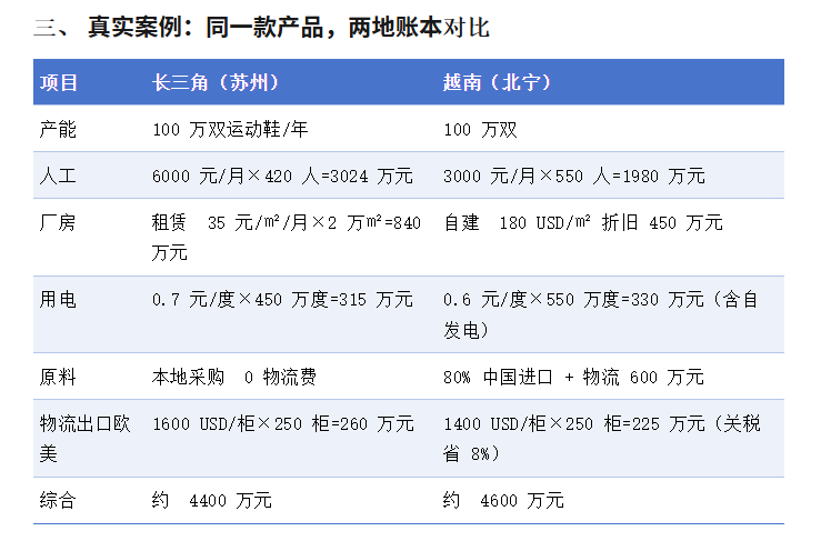 结果:越南版贵 200 万元/年,但省下 8% 关税(约 1800 万元),净利反而多 1600 万元——这就是大家还愿意搬的核心逻辑:关税>成本!