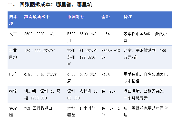 2025年,越南“人工+土地+税”三项显性成本仍低于中国,但综合制造成本已与中国长三角/珠三角打平,甚至略高 3%–7%。如果冲着“便宜”去,十有六七会失望;冲着“关税+产业转移”去,才值得认真算账。