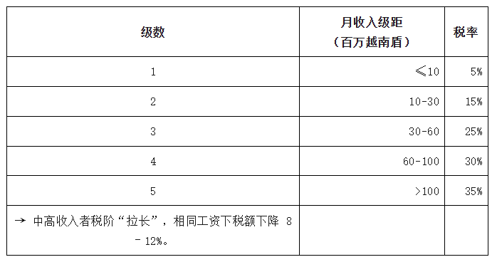 新法:5 级,35% 从 1 亿越南盾/月(≈2.8 万元)起跳